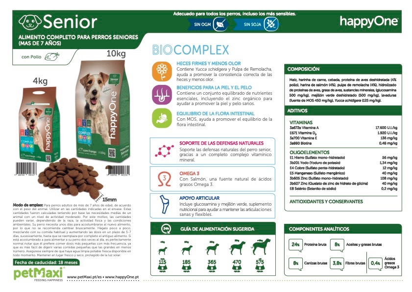 Maíz, harina de carne, cebada, proteína de aves deshidratada (4% pollo), harina de salmón (4%), pulpa de remolacha (4%), hidrolizado de proteínas de aves, grasa de aves, sustancias minerales, (glucosamina 500 mg/kg), mejillón verde deshidratado (500 mg/kg), levaduras (fuente de MOS 450 mg/kg), Yucca schidigera (125 mg/kg).