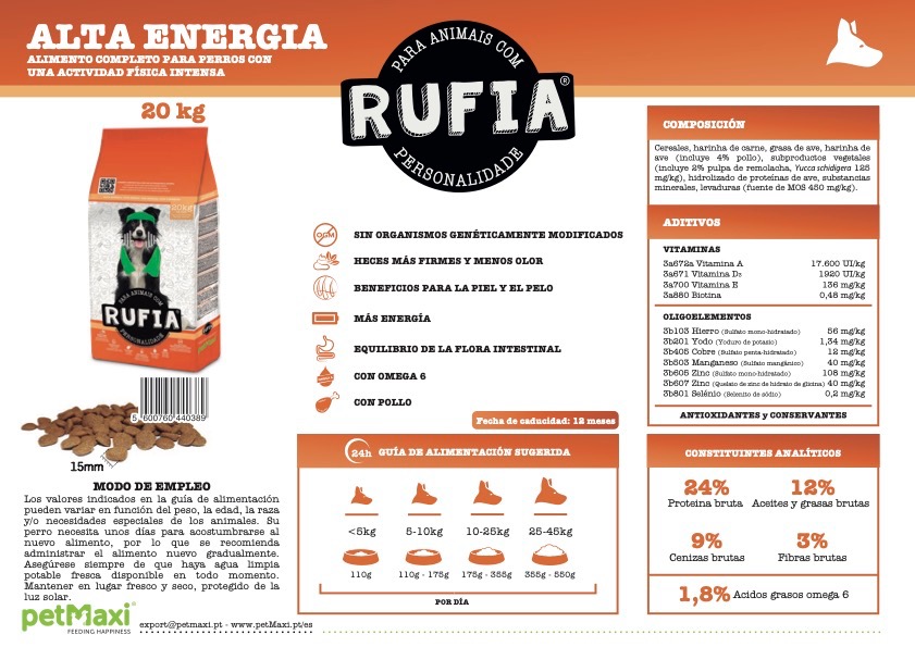 Cereales, harina de carne, grasa de ave, harinha de ave (incluye 4% pollo), subproductos vegetales (incluye 2% pulpa de remolacha, Yuca schidigera 125 mg/kg), hidrolizado de proteínas de ave, substancias minerales, levaduras (fuente de MOS 450 mg/kg).